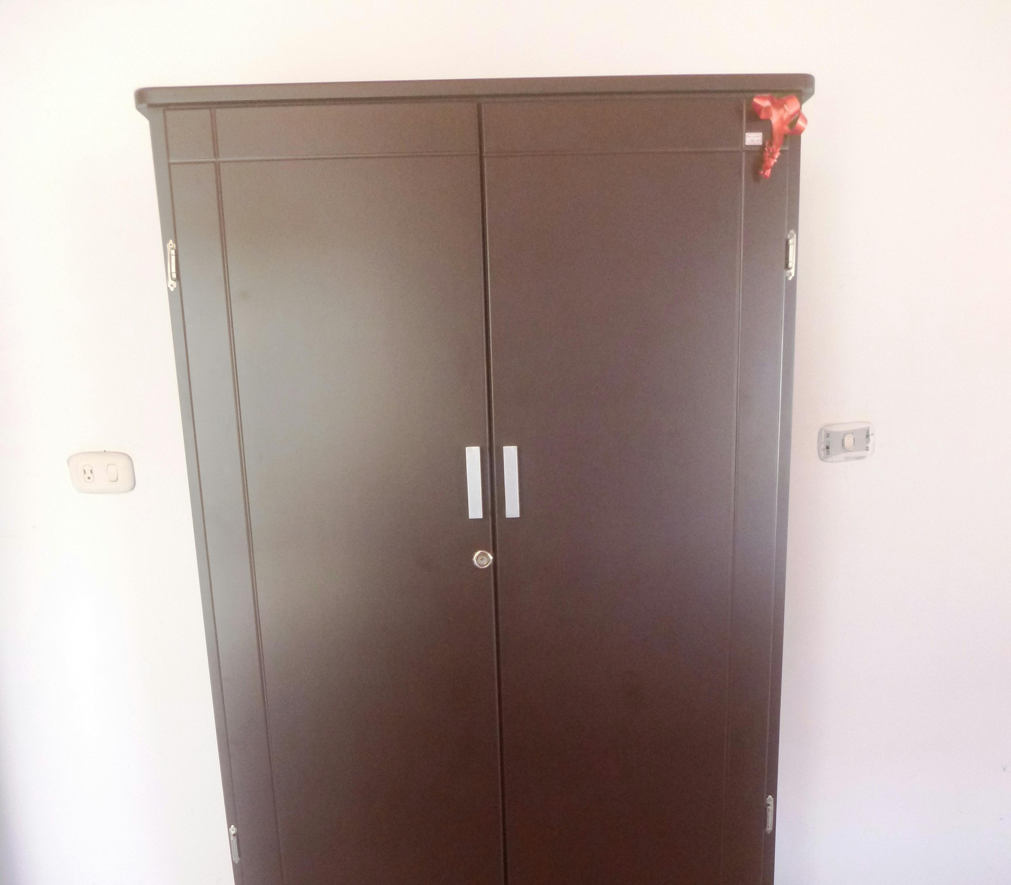 Available in black and brown, has a key to secure the doors, as well as a space to hang, two drawers, three shelves, and different wide spaces to store.